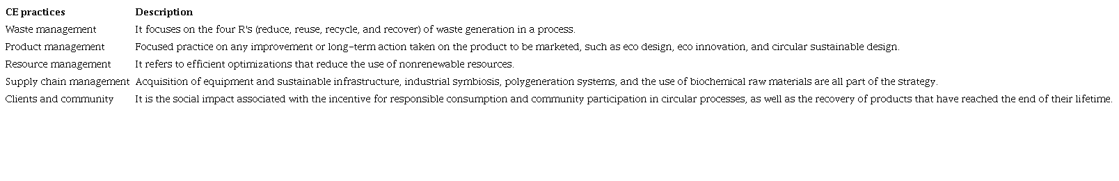 The CE is an economic model that aims to maximize efficiency in the use of natural resources and minimize the generation of waste. The CE disrupts the "take, make, dispose" linear model by focusing on reusing, repairing, renewing, and recycling products and materials [29]. The CE requires a shift in how products are designed, manufactured, and consumed, as well as how waste is managed. Instead of using natural resources to manufacture disposable goods, the CE promotes the use of renewable and durable materials that can be repaired or recycled when their useful lives are over [30].