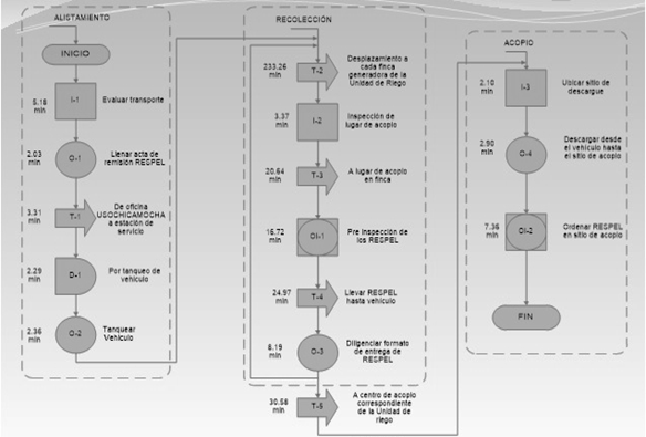 Initially, for the simulation model, a description of the activities that make up the process of collection and final disposal of empty pesticide containers and packaging was carried out, in addition to a time study. Fig. 3 shows the diagram of the reverse logistics process currently being carried out in the area under study, as well as the standard times for each of the activities, in which it can be seen that the longest time is spent on transportation to each of the farms, since the distances between farms are long and the geographic and road conditions are not optimal.