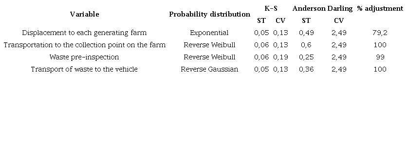 The discrete event simulation model was implemented taking into account the randomness of each of the identified variables. Table 1 shows the adjustment of probability distributions to each of the variables, which were verified through goodness-of-fit tests, the results of which are also shown.