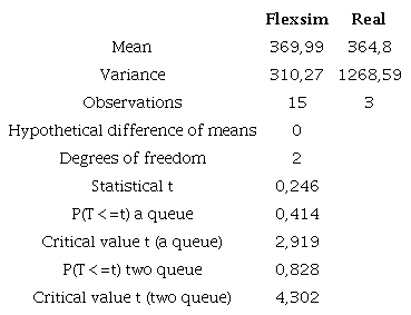Where n is the total number of replicates to be carried out, s is the standard deviation of the pre-sample, t is the theoretical value of the student t distribution with n-1 degrees of freedom, and a probability α and e refers to the admissible error. Table 2 shows the results of the test t developed for the validation, where it can be observed that the critical zone of this test is between -4.3 and +4.33, and as the statistic t is within this interval, it is concluded that there is no significant difference between the total time of the collection process of the two systems, not rejecting the null hypothesis of equality of means, so it is established that as there is no difference, the model developed in FlexSim is validated concerning the real system.