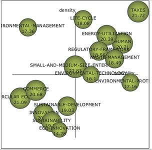 In the third period, see Fig. 11, the specialized topic is ENVIRONMENTAL MANAGEMENT, located in the fourth quadrant with a high density and centrality; it is worth mentioning that these two characteristics vary within the same quadrants. At the same time, the second quadrant includes other issues such as ENERGY-UTILIZATION, REGULATORY -FRAMEWORK, WASTE MANAGEMENT, LIFE CYCLE, TAXES, SMALL AND MEDIUM-SIZE-ENTREPRESI and HUMAN. In this cycle, the involvement of different actors and fields of application that identify issues required for the development of eco-innovation is evident. ENVIRONMENTAL PROTECTION and ENVIRONMENTAL TECHNOLOGY "are topics in the emerging quadrant, close to motor topics. On the other hand, CIRCULAR ECONOMIC, COMMERCE, SUSTAINABLE DEVELOPMENT, SUSTAINABILITY, INNOVATION, and ECO-INNOVATION remained basic themes.