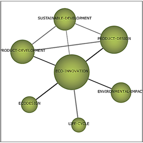 The eco-innovation cluster map, Fig. 12, shows the relationship of the main issues that are related, and the weight of their interaction is identified by the thickness of the line that unites them, being ECO-DESIGN, PRODUCT-DESING, PRODUCT-DEVELOPMENT, and ENVIRONMENTAL IMPACT. Likewise, the volume of the sphere of each one of these themes indicates the development of this theme in the literature analyzed in this study.