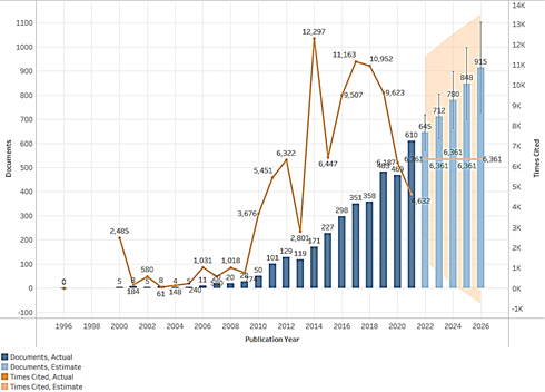 The year 2014 had the highest number of citations, 12,297 with 171 published documents. The year 2021 has registered the highest number of published documents and, the forecast for the next five years is incremental. On the other hand, the forecast for the number of citations is seasonal for the next few years.