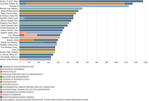 Based on the data processed in Tableau, Fig. 3 shows the top ten authors by number of citations. Among these, we can find [3], with 1293 citations with the article "A Literature and Practice Review to Develop Sustainable Business Model Archetypes", published in the journal Building and Environment, with a Q1 quartile. In second place, we find [48-50], with three publications accumulating 1,168 citations in the journals Journal of Cleaner Production, Energy Policy, Environmental Innovation and, Societal Transitions; the third place is for [44], with the publication "Redefining innovation - Research on eco-innovation and the contribution of ecological economics" with 1,129 citations.