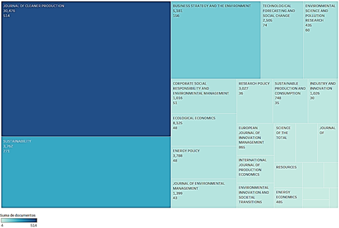 Fig. 4 show the leading 25 journals are identified based on the number of publications and citations. The Journal of Cleaner Production is the most significant source of eco-innovation documents, with 514 publications that gathered 30,476 citations in the study period 1996-2022, followed by the journal Sustainability with 3,762 citations and 271 papers. The journals that precede the main one show contrast in the number of articles and citations; that is, the number of documents is less, but the number of sources is higher; the journal Ecological Economics has a more significant number of citations (8,125 with 48 documents), while Energy Policy has the same number of documents (48), but with a lower number of citations (3,788). On the other hand, the journal Business Strategy and The Environment has 5,181 citations and 156 papers. Therefore, its color in the graph is darker. The remaining light blue illuminated magazines have between 4 and 51 publications.