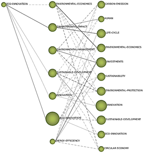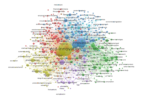 The keywords with the highest density related to eco-innovation are in the environmental field, such as environmental impact, ecology, sustainability, environmental economics and circular economy; Those related to the social, business and political aspects, such as human, collaboration, regulations, sustainable development goal, small and medium-sized enterprise, economic growth, economic development, among others, still find a relationship on the periphery of the map, which indicates that their relationship is not so close.