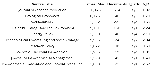 Table 2 lists the top 10 based on the number of citations and documents, their classification according to the quartile according to the impact factor in which they are located, and their SJR quality indicator. All the listed journals are highly impacted since they are located in quartile 1, highlighting the Journal of Cleaner Production with an SJR indicator of 1.92, although the Research Policy journal has a higher SJR index of 3.53, which surpasses the others listed. This table highlights that the journals that have published papers related to eco-innovation have had high impact.