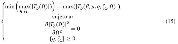 . Then, the optimality criteria approach is satisfied when any 2x2 minor determinant of the Jacobian matrix is equalized zero. By calculating such a determinant, a constitutive equation is obtained that completes the conditions to solve the overdetermined system. Therefore, the objective function given by eq. (8) can be precisely minimized at two resonant peaks by solving the following set of nonlinear equations.
