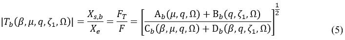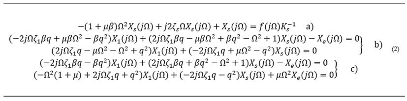 To apply the FPT, it is necessary to compute the transmissibility FRFs for the dynamic systems described in Fig. 2 b) and c). Such dimensionless functions can be computed by simultaneously solving the sets of eqs. (2) (b) and (c). By doing this, the following are obtained.