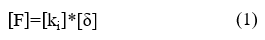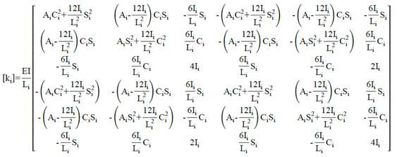 The prototype was assembled using tubular sections of 101 mm (4 in.) diameter with 4 mm (3/16 in.) thickness; the flanges were 175 mm (6 7/8 in.) in diameter and 10 mm (3/8 in.) thick; the gussets were triangular, with a 35 mm (1 3/8 in.) base, 101 mm (4 in.) height and 6 mm (1/4 in.) thickness in the upper section and 8 mm (5/16 in.) in the lower section. The prototype was 2 meters tall. Fig. 2 shows the elements and nodes used. Each node had 3 degrees of freedom: displacement in the X axis (δXi), displacement in the Y axis (δYi) and rotation in the Z axis (θi), with force applied at node 12 (F=2533.4 N). Each element had its equivalent stiffness (ki), with the result that the equilibrium could be described using eq. (1):
