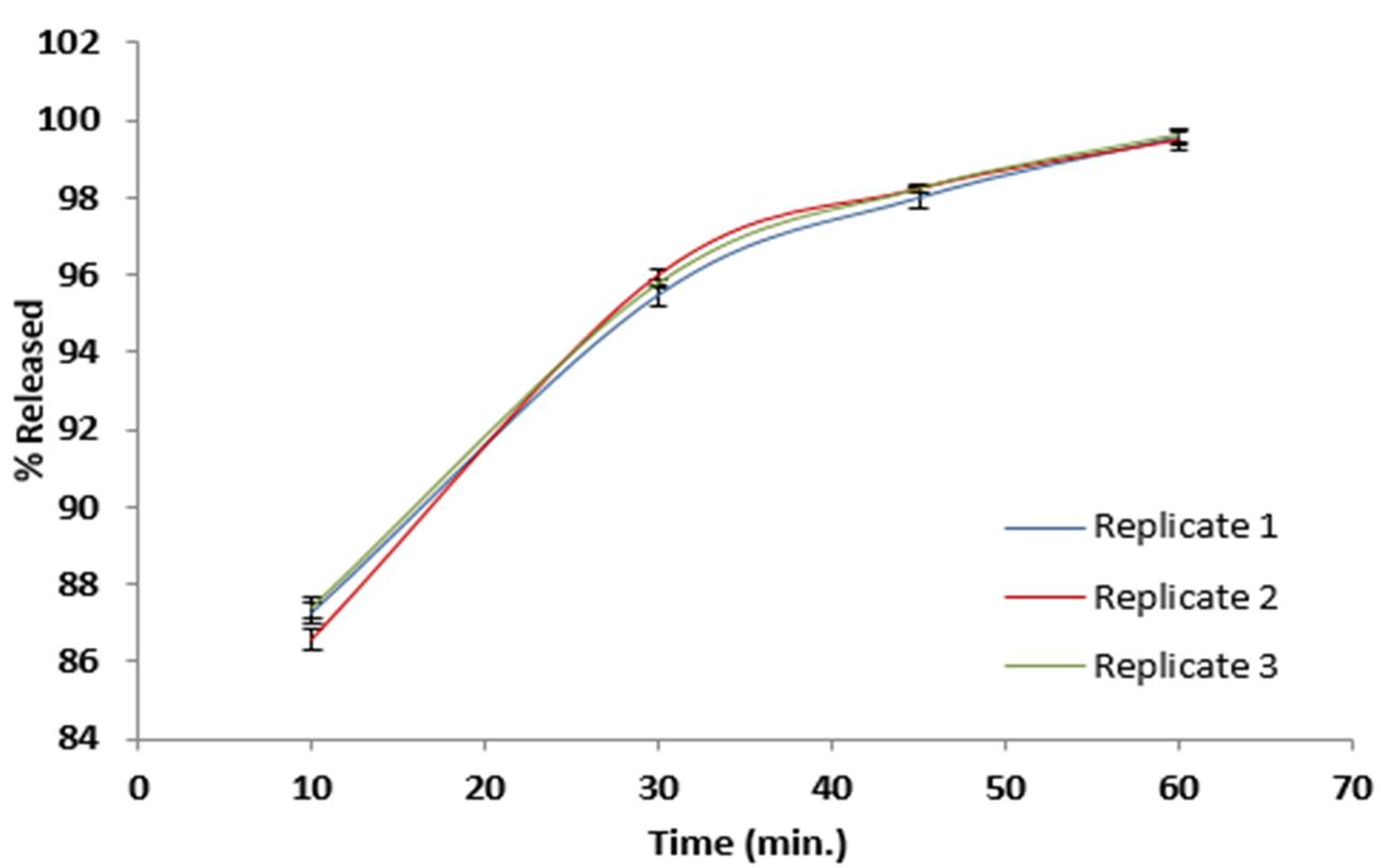 Fig. 3 shows the influence of encapsulating agents on vitamin A release behavior from microencapsulated oil. The release rate of the encapsulated product was rapid, and more than 85% of vitamin A content was dissolved within 10 minutes. The results of the present study indicate that the release rate of vitamin A from microencapsulated oil was not influenced by the specific combination of encapsulating agents that was used. Therefore, the release behavior for vitamin A was not affected by the viscosity of chitosan solution.