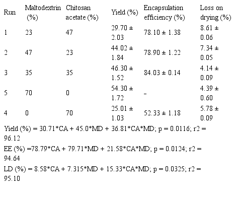 The calculated probability values (p) for yield, EE and LD are summarized in Table 1. Values were lower than 0.05 (p=0.0116 for yield; p=0.0124 for EE and p=0.0325 for LD). In general, results showed that CA and MD effects did not exhibit the same pattern. MD percentage appeared as the statistically-significant main effect, having a positive influence in terms of yield and microencapsulation efficiency. The interaction between both factors (percentage of MD and CA) showed a significant negative effect on LD. These results can be explained by model equations and adequate r2 values.