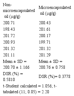 Results in Table 2 show a student-calculated t value that was lower than the tabulated t value, showing no statistically-significant differences between the vitamin A content of non-microencapsulated oil and that of microencapsulated oil. Consequently, this confirms the feasibility of microencapsulating shark liver oil by spray-drying, as a process that does not affect vitamin A content.
