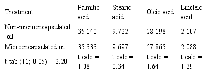 In order to demonstrate the applicability of the proposed microencapsulation process to protect the fatty acids in shark liver oil, we determined the selected fatty acids (palmitic, stearic, oleic and linoleic) in microencapsulated oil. Results in Table 3 show student-calculated t values that were lower than the tabulated t value, showing no statistically-significant differences between contents of selected fatty acids of non-microencapsulated oil and microencapsulated oil, at 95% confidence.