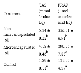 For the statistical analysis, the program PASW Statistics (SPSS Inc. version 18) was used. The evaluations to the statistically-significant differences between the vitamin A and fatty acids content of non-microencapsulated oil and microencapsulated oil was calculated based in test t-Student. For antioxidant assays, the values are expressed as mean ± standard deviation of experimental values. Statistical analysis was performed with SPSS 12.0 software. For multiple comparisons, one-way ANOVA was used followed by Bonferroni post-hoc test. Values of p<0.05 were considered statistically significant.