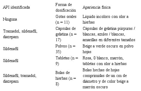 Entre 80 formulaciones de hierbas analizadas, aproximadamente el 27% tenía al menos un ingrediente farmacéutico activo. Tres formulaciones contenían sildenafil, tramadol y diazepam en combinación entre sí. Por lo tanto, las leyes y regulaciones existentes deberían exigir requisitos sólidos para analizar las hierbas medicinales y evaluar su seguridad y eficacia.