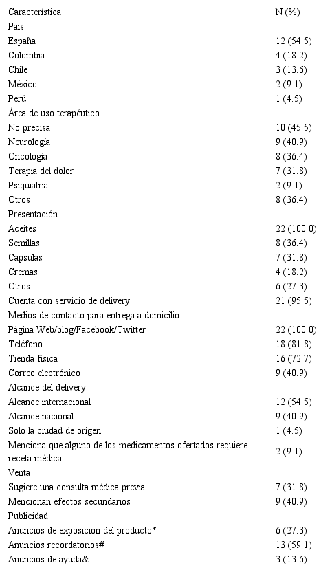 Se encontró un total de 22 páginas web, cuyas características se resumen en la Tabla 1. Los países con más páginas web fueron: España, probablemente debido a que hace no mucho el uso medicinal de la marihuana era legal, y Colombia, probablemente debido a la legalidad de la marihuana en dicho país. Por otro lado, no se encontraron páginas web que vendan estos productos en Uruguay donde el consumo de la marihuana medicinal es legal.