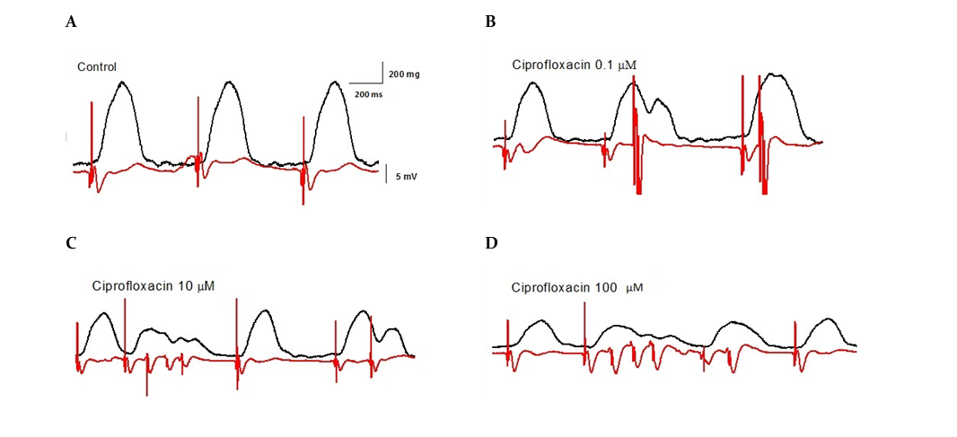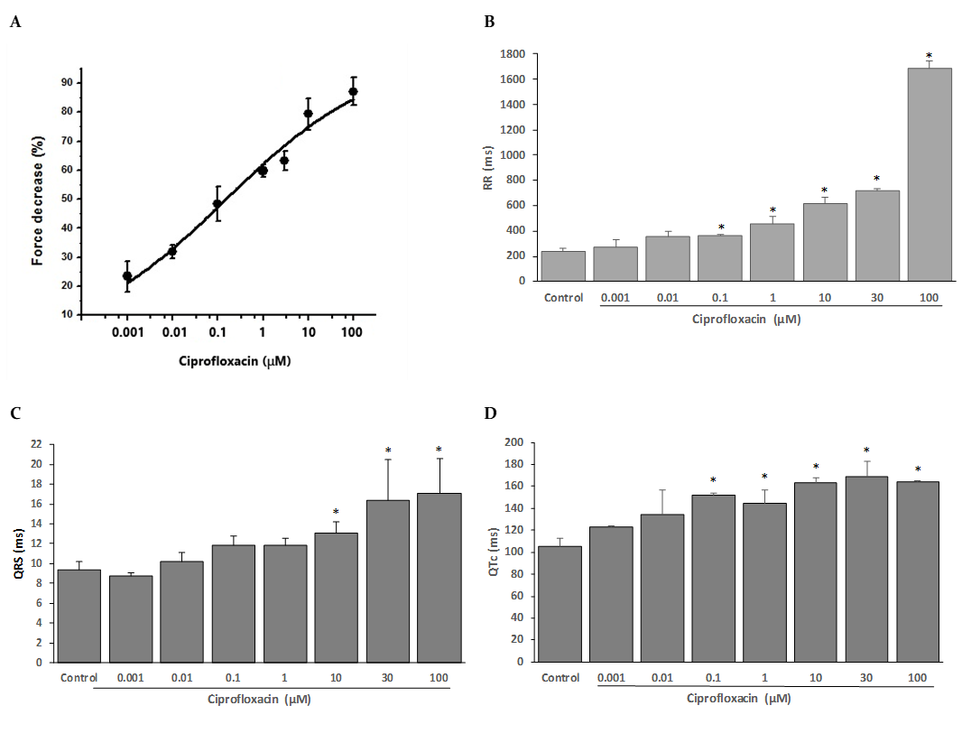 The present findings clearly highlight the negative inotropic action of ciprofloxacin in a concentration-dependent manner, and the prolonging RR, QTc, and QRS actions. These results suggest that ciprofloxacin exerted a multi-ion channel–blocking action in the heart, and it that requires further studies. These conclusions may account for clinical data that have been reported previously.