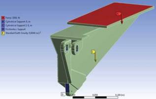 Las condiciones de carga que experimenta la pieza se presentan en la figura 1, donde se aplicó una condición de carga central en la superficie plana superior con un valor de 1500N equivalente al peso de una persona promedio con su respectivo equipo de mantenimiento (condición A). Se tiene presente también que la pieza esta soportada en sus puntos de anclaje mediante un pasador (condiciones B y C) y apoyada en su parte trasera inferior donde hace contacto sin fricción con la aeronave para prevenir rotación del soporte (condición D). Finalmente se consideró la carga debida al propio peso de la pieza por acción de la fuerza de gravedad (condición E).