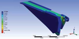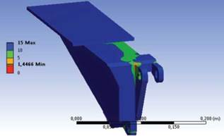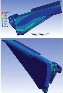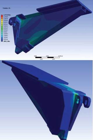 Con el fin de mejorar las propiedades mecánicas del pie de apoyo, se procedió a la modificación de sus características geométricas. El enfoque original durante el proceso de rediseño fue mejorar la distribución de la masa a lo largo del volumen de la pieza, reforzar los puntos críticos de concentración de esfuerzos y eliminar refuerzos adicionales innecesarios para reducir la masa de la pieza. Se aplicaron las mismas condiciones de carga que se determinaron para el pie de apoyo original, con el fin de obtener los estados de esfuerzos presentados en la figura 4.