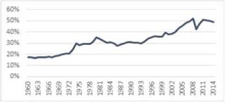 El comercio internacional ha experimentado un incre mento significativo con respecto a la producción de bienes y servicios desde la década de los 60's (figura 1), tanto así, que hoy en día representa alrededor del 49% del PIB a nivel mundial 6. Los principales da tos de comercio exterior corresponden al valor de las exportaciones e importaciones de bienes y servicios, éstos son indicadores ampliamente conocidos, y que definen en gran medida el nivel de internacionaliza ción de una economía o país 7.