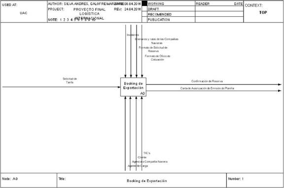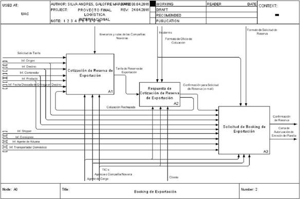 ABSTRACT: This article aims to document the process of Booking or Export Reserves' Management, executed by the International Freight Forwarders (IFF); those who are in charge of the transportation process from coordination to execution, allowing the goods to reach international clients. The methodology to characterize the process is IDEF0, through which the inputs, outputs, constraints and mechanisms involved in each stage of the process are modeled from the point of view of a load agent. Finally, an information exchange model was built according to the reality of the Export Booking Process that involves the different actors in the supply chain and serves as a basis for the development of the most advanced models of process architecture, improvement of interoperability and business integration.