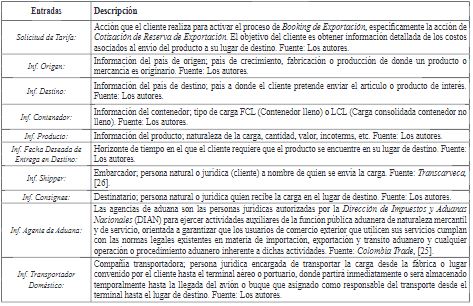 Solicitud del Booking de Exportación (A3): el proceso finaliza con la entrada de los datos corres pondiente a la exportación siendo necesarios los procesos aduaneros e intermediarios: (a) Informa ción del shipper, (b) información del consignee, (c) información del agente aduanero, y (d) informa ción del transporte doméstico o interno. El Formato de Solicitud de Reserva se vuelve el parámetro que contiene las características o condiciones del em barque, la finalidad de la actividad consiste en la confirmación de la reserva para al cliente o expor tador, y la carta de autorización para la emisión de la planilla.
