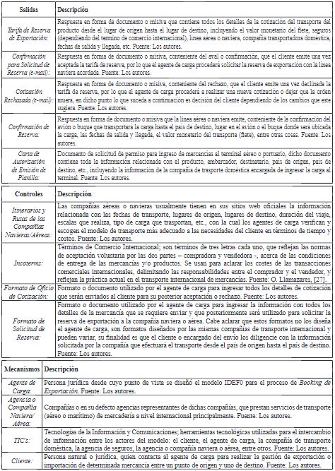 RESUMEN: Este artículo tiene como propósito documentar el proceso de Booking o Gestión de Reservas de Exportación, realizado por los Agentes de Carga Internacional; quienes se encargan del proceso de transporte desde la coordinación hasta la ejecución, permitiendo que las mercancías lleguen a los clientes internacionales. La metodología para caracterizar el proceso se denomina IDEF0, a través de la cual se modelan las entradas, salidas, restricciones y mecanismos involucrados en cada etapa del proceso desde el punto de vista de un agente de carga. Finalmente, se construyó un modelo de intercambio de información acorde a la realidad del Proceso de Reserva de Exportación que involucra los diferentes actores de la cadena de suministros, y sirve como base para el desarrollo de modelos más avanzados de arquitectura de procesos, mejora de la interoperabilidad e integración empresarial.
