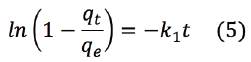 La ecuación de Lagergren es la más ampliamente apli cada, esta fue la primera ecuación de velocidad para la sorción de los sistemas líquido-sólido basado en la capacidad sólida 16. Este modelo se define mediante la ecuación 5.