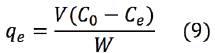 La capacidad de adsorción de azul de metileno en el equilibrio se puede calculó con la ecuación 9.