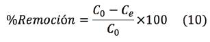 El porcentaje de remoción se calculó mediante la ecua ción 10.