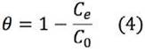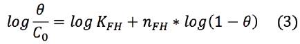 Donde Θ indica el grado de cobertura de la superficie del adsorbente, K FH y n FH son las constantes de equilibrio Flory -Huggins (L/mg). El grado de cobertura de la superficie del adsorbente se calcula utilizando la ecuación 4.