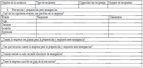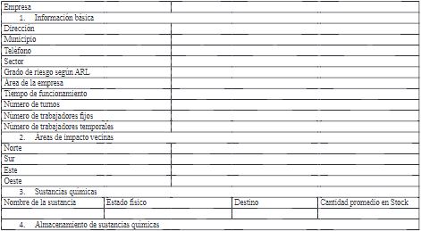 Para lo cual se realizó una entrevista y aplicó una en cuesta donde se identificó la actividad económica y razón social; cantidades de materiales peligrosos en almacenamiento, en proceso y/o en el transporte; la política y objetivos corporativos respecto a la gestión del riesgo; estructura organizacional y los procedi mientos para la preparación y respuesta ante emer gencias y recursos disponibles para su prevención, control y mitigación; existencia de planes de ayuda mutua, planes de capacitación y entrenamiento para las brigadas de emergencias (tabla 1).