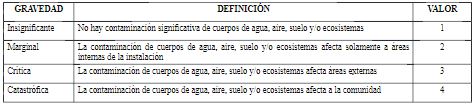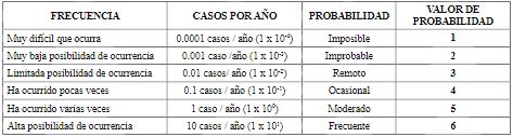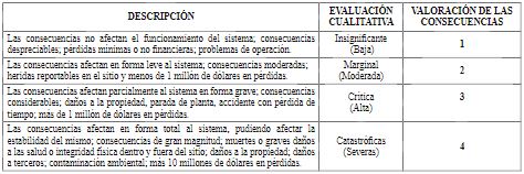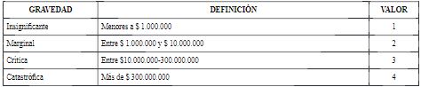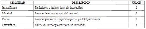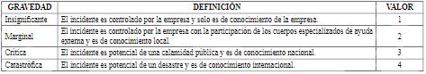 Para el análisis de riesgo por escenario se desarrolló la matriz probabilidad vs consecuencias para cada factor de vulnerabilidad definido, víctimas, impacto ambiental, pérdidas económicas (esta se adaptó a cada empresa de acuerdo a su capital económico), imagen corporativa y operación de la planta (tablas 6, 7, 8, 9, 10). La evaluación de las consecuencias de cada esce nario de riesgo se hizo adaptando el modelo propues to por (18, 19). La "Matriz de Aceptabilidad de Ries gos" tiene por objeto la determinación de las zonas de "aceptabilidad" de los riesgos para el sistema, sobre la base de la matriz de riesgos del sistema; en ella se de finen los niveles de riesgos, tal como: Zona Aceptable, Zona Tolerable y Zona Inaceptable 19.