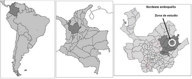 En la figura 1 se muestran las zonas mineras al nordeste de Antioquia - Colombia. La escala de contaminación por mercurio de la zona de estudio es alarmante, pues las actividades mineras se llevan a cabo sin asistencia técnica y de manera rudimentaria. El procesamiento del mineral aurífero de forma artesanal consiste en la adición de mercurio a todo el mineral que contiene el metal precioso y luego la mezcla de mercurio-mineral es reducida de tamaño en pequeños molinos de bolas conocidos como "cocos", este proceso es denominado amalgamación del mineral, pero es sabido que este proceso propicia perdidas de mercurio en relaves y efluentes (3, 4). Se estima que más de 100 toneladas de mercurio al año son emitidas por la minería artesanal de oro en Colombia 4.