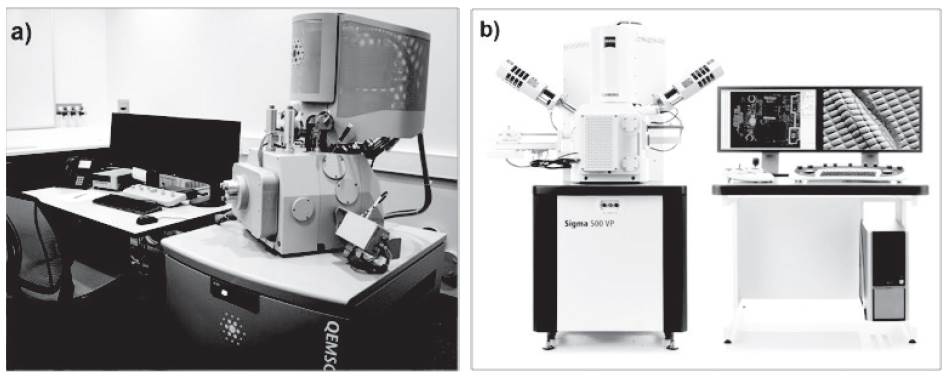 El análisis por QEMSCAN (Quantitative Evalua tion of Minerals by SCANning electron microscopy), consta de un microscopio electrónico de barrido, equipado con cuatro detectores de rayos X de disper sión de energía con elementos ligeros y una unidad de procesamiento electrónico diseñada por Intellec tion. En mineralogía automatizada se utiliza un mi croscopio electrónico de barrido y múltiples espec trómetros de rayos X para determinar la estructura y composición de las rocas a nivel microscópico (8,9. En la última década el análisis por QEMSCAN ha sido bastante utilizado para la caracterización de diferentes depósitos minerales, por ejemplo, depósitos no sulfuros de Zn(Pb) 10, bauxitas 11, depósitos de lateritas Ni-Fe 12,13, depósitos de oro 14,15 y elementos de tierras raras 16. Una foto del equi po QEMSCAN se observa en la figura 2a. El análi sis por FE-SEM (Field Emission - Scanning Electron Microscopy) consta de un microscopio electrónico de barrido de emisión de campo de referencia Sigma 300 fabricado por la marca ZEISS (r). El programa de identificación Mineralogic Mining realiza un análisis del mineral completamente automatizado para iden tificar y cuantificar minerales (oro en este caso) en tiempo real, mediante la combinación del microsco pio electrónico de barrido con uno o más detectores EDS (Energy-Dispersive x-ray Sepctroscopy) 17. La caracterización por FE-SEM es aplicada en la caracte rización de diferentes depósitos, como por ejemplo, depósitos de hierro 18,19, de plomo 20, de ilmenita 21, de manganeso 22 y carbón 23, entre otros. Una foto del equipo FE-SEM de ZEISS se observa en la figura 2b.