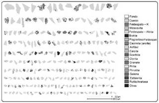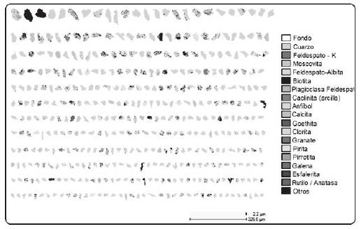 Con respecto a las asociaciones mineralógicas, las partículas minerales reportan asociaciones en cua tro categorías que se muestran visualmente: granos libres, liberados, minerales binarios y minerales ter narios. Los granos "libres" se refieren a partículas con >95% de su superficie identificada de un mineral dado, mientras que grano "liberado" se refiere a par tículas con >80% de su superficie identificada con un mineral dado.