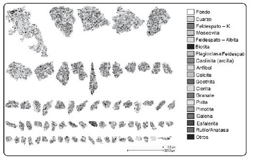Las imágenes en falso color son asociadas a un subgru po de partículas de cada yacimiento analizado, orde nada cada imagen por tamaño de área analizada. En la figura 3 se observan que las partículas del Yacimiento 1 presentan tamaño fino; con respecto a la mineralogía se presentan mayormente partículas libres y liberadas de cuarzo, también se observan partículas con mezclas de varios minerales y partículas liberadas de moscovi ta en mayor proporción, pirita, feldespato potásico, y calcita. Además se determinan partículas binarias de feldespato potásico - cuarzo y pirita - biotita y par tículas ternarias de cuarzo - esfalerita - biotita y fel despato potásico - biotita - calcita. Las partículas de mezclas minerales se componen de cuarzo, feldespato potásico, moscovita, feldespato-albita, biotita, calcita y pirita.
