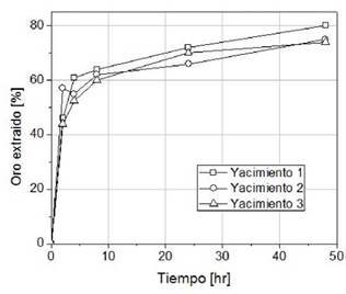 En la figura 6 se observan las curvas cinéticas de las pruebas de cianuración de oro para cada muestra. Es interesante observar que ya sea un yacimiento rico o pobre, presenta un comportamiento cinético similar durante el proceso de cianuración. El hecho que sea posible una recuperación de oro superior al 75% es una prueba fehaciente de que es posible remplazar la amalgamación por la cianuración, pues con el mer curio se obtienen recuperaciones entre el 40 y el 60% únicamente.