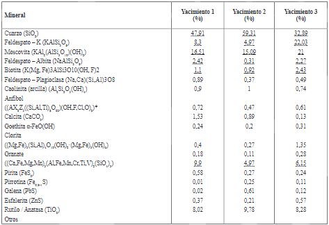 Se demostró que los yacimientos se encuentran forma dos principalmente por cuarzo, moscovita y feldespa to potásico, además de otras fases menores como piri ta, biotita y clorita, entre otras (ver figuras 3, 4 y 5). En los yacimientos 1 y 3 el oro se presenta principalmente como nódulos nanoscópicos esparcidos en la pirita y la moscovita (ver tablas 2, 3 y 4). En el yacimiento 2 el oro se presenta principalmente como electrum en par tículas de varios micrones de tamaño (ver tabla 3). En las tres muestras se encuentra oro unido a la anatasa. Los yacimientos que actualmente están siendo trata dos con mercurio exhiben minerales de pirita y gale na; y además presencia de oro submicroscópico, con lo cual se demuestra que la amalgamación no es el méto do ideal para el tratamiento de los yacimientos de oro del nordeste antioqueño.
