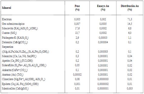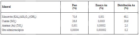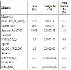 La tabla 4 muestra que el oro presente en el Yacimiento 3 se encuentra de forma nodular en la moscovita en un 68% y el 29% se encuentra en el cuarzo en modo de electrum. Solamente el 0,2% del oro se encuentra de forma nodular en la pirita (oro submicroscópico).