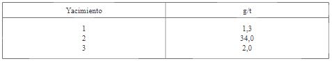 La tabla 5 entrega los resultados del ensayo al fuego para las tres muestras minerales. La muestra con más alto contenido de oro es el Yacimiento 2 con 34 g/t, lo cual es un valor alto pero no excepcional en esta región del país. La segunda muestra con mayor conte nido de oro es el Yacimiento 3 con 2 g/t, y la muestra con el menor contenido de oro es el Yacimiento 1 con 1,3 g/t. Estos valores son los que se utilizan para rea lizar el balance de masa en las pruebas de lixiviación con cianuro.