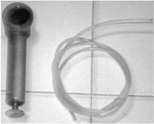 Las muestras de aceite que se tomaron fueron de 60 cm3 cada una, correspondiente a la capacidad de los re cipientes plásticos receptores de muestras. Se empleó el Método de pistola de vacío con la cual se extrajeron muestras de aceite de motor representativas de forma rápida y con poco esfuerzo. El proceso consistió en introducir un tubo plástico nuevo, limpio y flexible con una longitud suficiente para conectar la pistola al reservorio o cárter del equipo y por vacío (creado por la pistola) extraer la muestra, la cual fue etiquetada se gún el motor, equipo, horas de funcionamiento y fecha de obtención. Para su recolección se empleó el Kit de servicio para toma de muestras de aceite proveídos por la empresa Gecolsa S.A, distribuidores autoriza dos de la empresa Caterpillar en Colombia. Para cada muestra fue empleado un kit completamente nuevo. Ver figura 1.