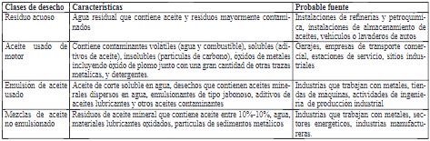 El recurso como alternativa de aprovechamiento, se inicia con un pre-tratamiento que dependerá de sus caracterís ticas acorde con la clase de desecho y la fuente de donde provenga tal como se muestra en la Tabla 1; el cual con siste en eliminar burdamente una gran parte de los con taminantes presentes en el mismo, como lo son el agua, partículas gruesas, lodos, polvos, hidrocarburos ligeros, entre otros. Lo conforman varios procesos entre los que se destacan: filtración, decantación, centrifugación, deshidratación, calefacción, tratamiento térmico, destilación at mosférica, desasfaltado, desmetalización, tratamiento quí mico, entre otros procesos. El proceso de reciclaje ha mos trado la posibilidad de obtener aceites de buena calidad a partir de aceites usados de motor. En esta investigación se mostró que el costo es relativamente bajo en comparación con su producción a partir de petróleo crudo. Además, los subproductos del proceso pueden ser convertidos en pro ductos finales valiosos para otros procesos de fabricación. Los rendimientos de estas transformaciones podrían cu brir el costo de la compra de los químicos necesarios para mantener la planta de reciclaje y, por tanto, que el proceso sea potencialmente rentable (11).