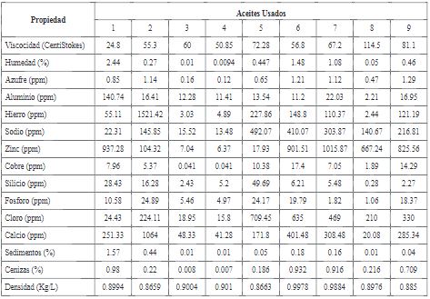 La metodología utilizada consistió en la caracteriza ción fisicoquímica de las nueve muestras de aceite descritas anteriormente. Las muestras de la 1 a la 7 corresponden a aceites usados de marcas comerciales reconocidas en Colombia; la muestra 8 corresponde a aceite nuevo y la 9 corresponde a mezclas de aceites usados. Una vez tomadas, se enviaron al Laboratorio de prestación de servicios de la Universidad de Car tagena, en donde se les hizo el análisis físico-químico respectivo, haciendo uso de las técnicas siguientes: viscosimetría para determinar la viscosidad de cada muestra, el método de Kart Fisher para determinar porcentaje de humedad, densimetría para determinar la densidad de cada muestra y absorción atómica para determinar metales, sedimentos y cenizas 15-16-17-18-19-20.