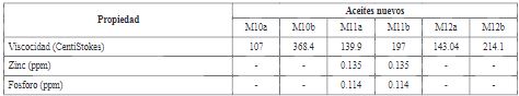 La menor viscosidad que presenta la muestra M10a (107Cst), se debe a los aditivos y condiciones opera tivas para las cuales se diseña el aceite. La muestra M10b, posee una mayor viscosidad (368,4Cst), debido a que se diseña para equipos de trabajo pesado con mayor tiempo de operación entre cambios y excelen te funcionamiento a altas y bajas temperaturas. Las demás muestras (M11a, M11, M12a y M12b) de acei tes poseen una relativa viscosidad cercana a la media calculada y puede atribuírsele su cercanía al tipo de aceite ya que son del tipo SAE 40 o 50, es decir, de vis cosidades moderadamente altas.