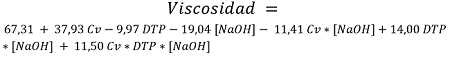 Conjuntamente, la ecuación 3 presenta el modelo de la viscosidad para describir el comportamiento de la suspensión, teniendo en cuenta los resultados del ANOVA realizado al excluir la interacción doble DTP* (NaOH) en unidades codificadas, es:
