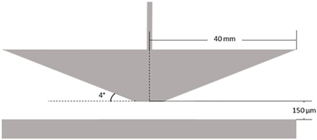 La geometría utilizada en el reómetro para la medición de la viscosidad de la suspensión fue una geometría cono-plato 4-40 (4° y 40 mm de diámetro), con un GAP predeterminado de 150 micras constante en todo el tiempo de experimentación.