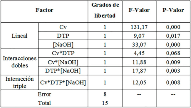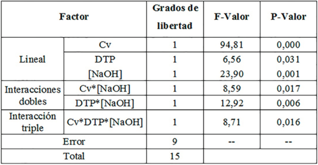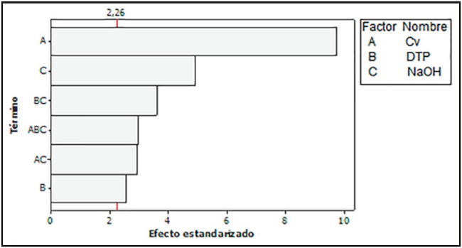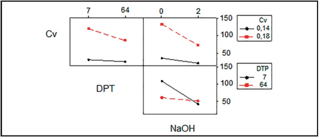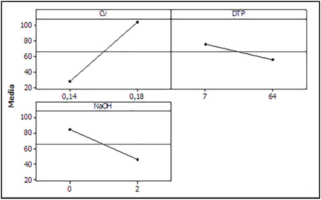 La figura 4 muestra los efectos principales de los tres factores de estudio en los niveles bajo y alto, los factores Cv y NaOH, presentan una pendiente más inclinada, y se observa que el cambio en la variable respuesta cuando pasan de su nivel más bajo a su nivel más alto es significativo; sin embrago, este comportamiento no es tan notorio para el factor B (DTP) tal como se muestra en la tabla 4 (ANOVA).