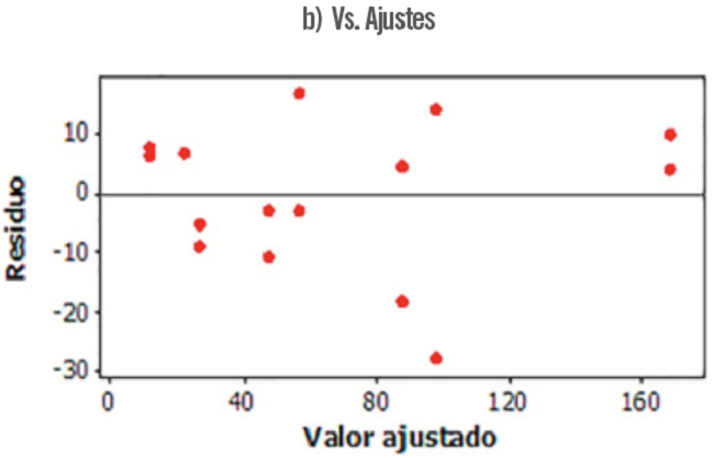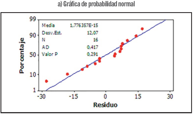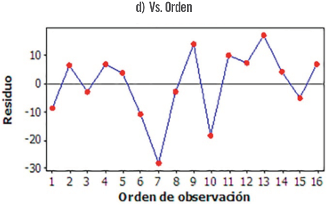 Los resultados de la verificación de supuestos (figura 7 indica que existe una distribución normal debido a que los puntos se ubican sobre la recta en la gráfica de probabilidad normal (figura 7a) y su P-valor es mayor al α definido de 0,05 por lo cual no se rechaza la hipótesis nula de ajuste normal. En la gráfica de residuos vs ajustes (figura 7b) se observa una distribución de datos sin un patrón por lo cual se cumple con el supuesto de que los residuos tienen varianza constante. En la gráfica de probabilidad normal de los residuos (figura 7c) se observa que la media del histograma es aproximadamente cero. En la gráfica de residuos vs orden (figura 7d) se observa un patrón aleatorio alrededor de la línea central por lo cual se cumple con el supuesto que los errores son independientes entre sí.
